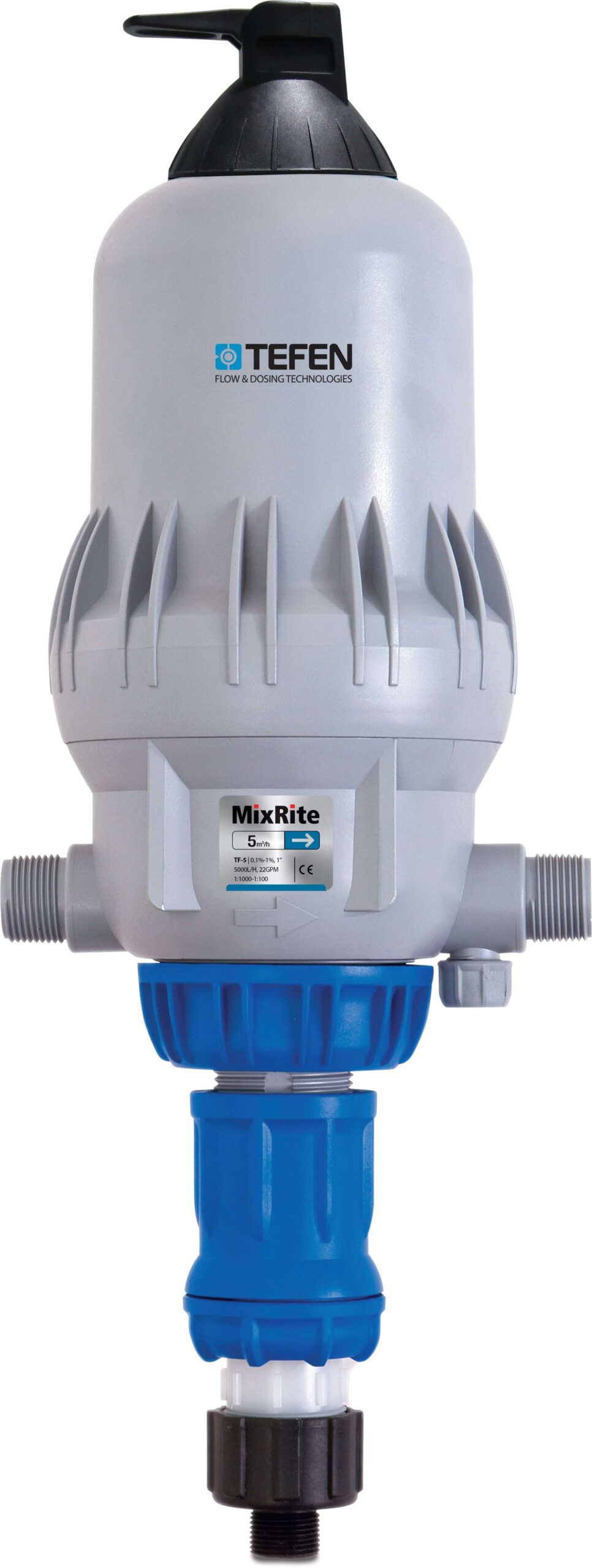 Lihtsasti paigaldatav ja läbivoolava vee jõul töötav MixRite TF5 0,2-2% väetisedosaator täpseks ja paindlikuks kastmisväetamiseks.
